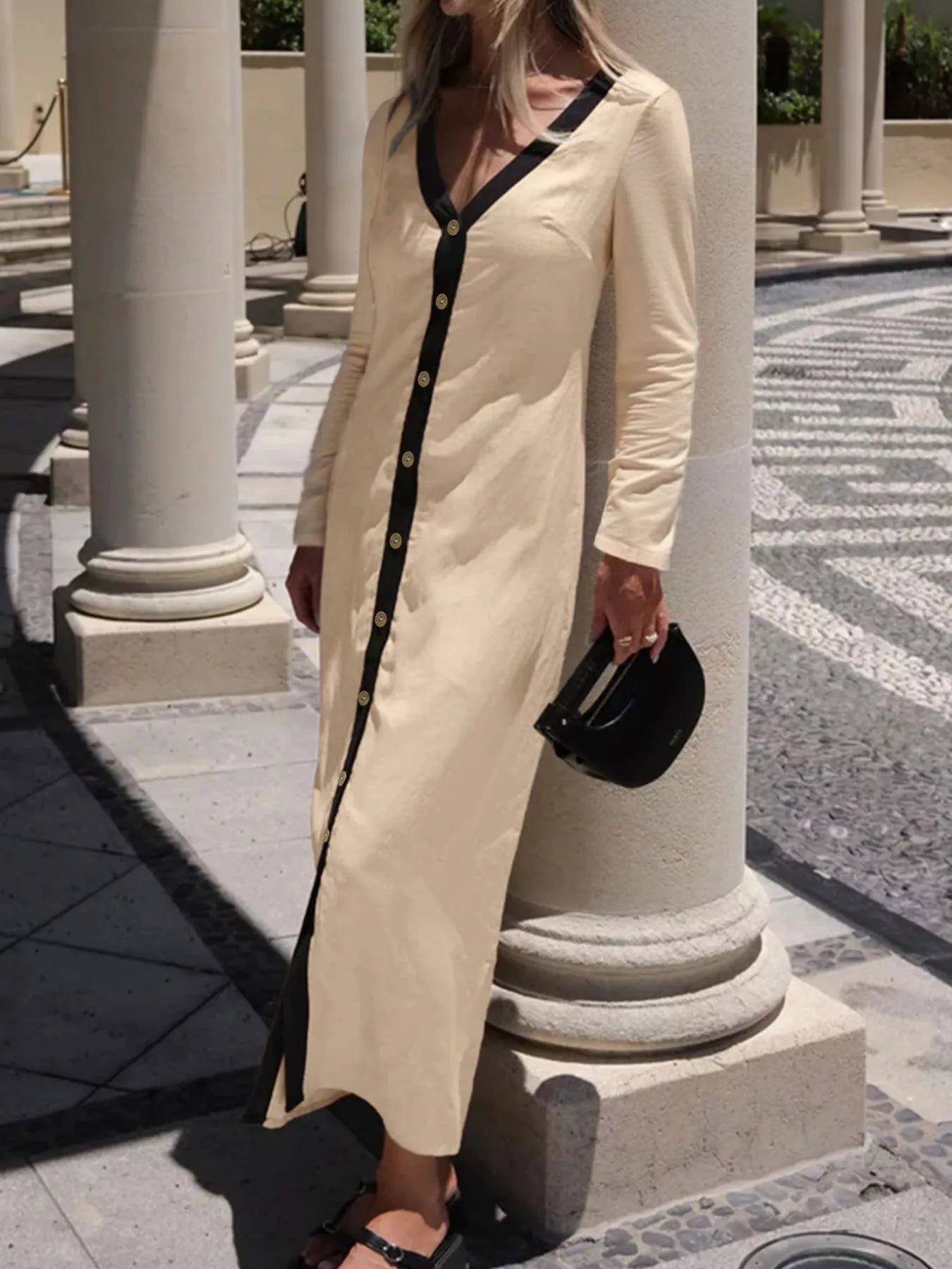 Contrast Trim Button-Down Midi Dress